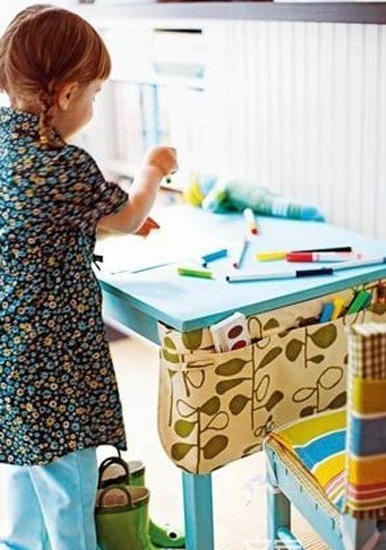 装园艺工具的帆布袋经过一点微小改动后成为孩子们的画笔收纳袋,尼龙搭扣的设计让袋子伏贴于桌子旁边,从此宝贝儿的画笔就不会再到处乱滚了。