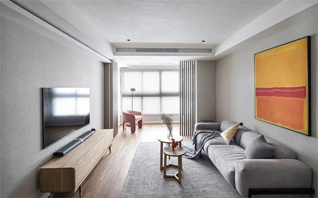 客厅以原木色和鉻黄色搭配,原木色质感温润,鉻黄色醒目稳重,阳台带来的温暖阳光,营造出静谧优雅的美学氛围,是舒适生活的标配。