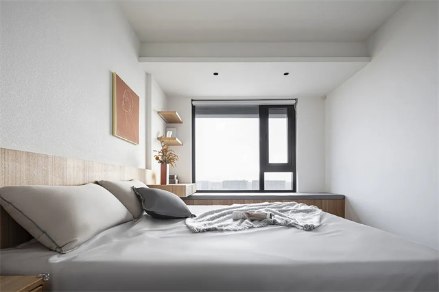 卧室和客厅一样采用了无主灯设计,同时对中央空调的出口做了隐藏化处理。对于吊顶的积灰问题,设计师选择用硅藻泥来解决,这样更不容易积灰。